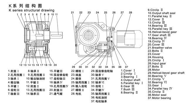 以下是K型斜齒螺旋錐齒輪減速機(軸伸式斜齒螺旋錐齒輪減速機)結(jié)構(gòu)圖